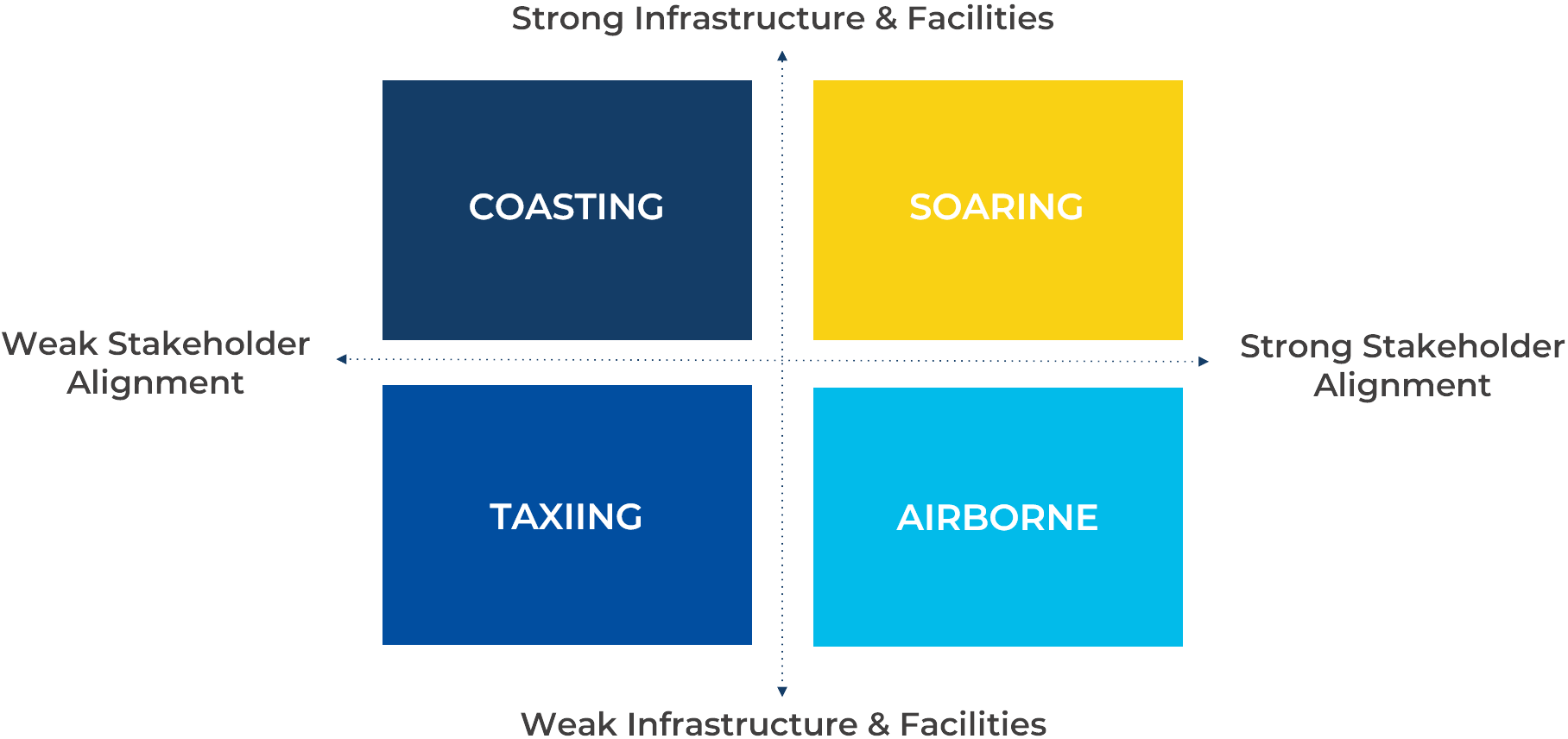 Mapping the two critical success factors, with an industry average center point, allocates each airport into one of four possible scenarios: AIRBORNE, TAXIING, COASTING, or SOARING.
